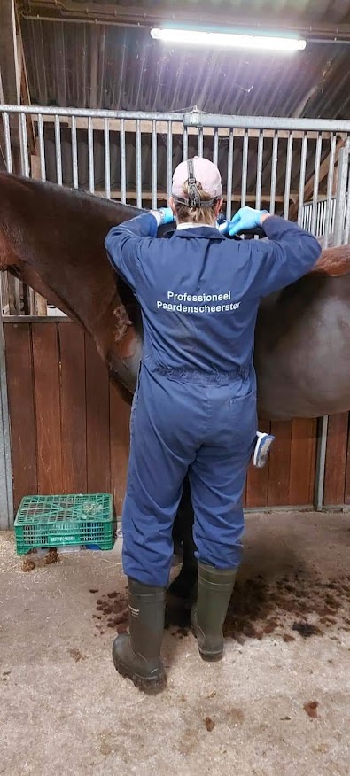 Afgelopen jaar ook gestopt met van adres naar adres gaan om verspreiding van ziektes tegen te gaan. Al mijn apparatuur wordt direct na het scheren schoongemaakt en ontsmet. Per adres gebruik ik één overall en 1 kledingset die na het scheren allen op 90 graden wordt gewassen. Tevens scheer ik sinds de corona-uitbraak met een mondkapje en handschoenen. Een fijne bijkomstigheid is dat mijn longen veel schoner zijn dan voorheen en de handen ook niet zo vies, een win-win situatie. Al is het voor sommige paarden nog wel even schrikken in het begin, maar die spanning vloeit vaak wel weg nadat ik even aan het scheren ben.