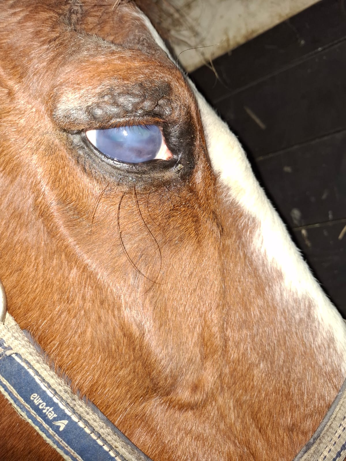 Die maandagochtend was de laatste keer dat ik hem had behandeld en woensdag erop deed ik de stal 's ochtends open om hem te voeren en ik kon wel janken, maandag niks te zien en nu zat er weer helemaal een soort van vlies op zijn oog en hij kneep hem nu ook samen, voor mij een teken dat hij nu ook pijn had en dat is niet de bedoeling.